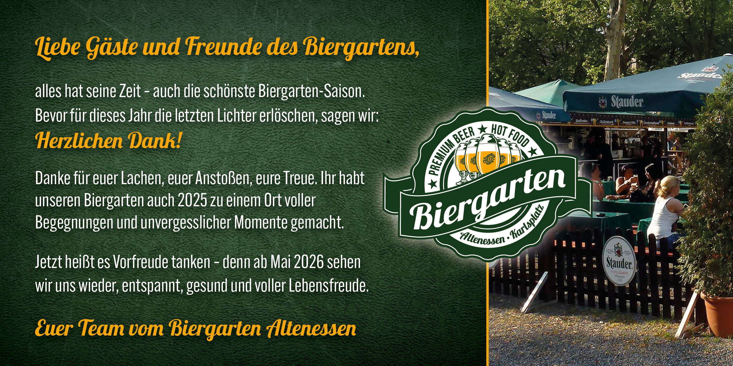 Bei schönem Wetter ist der Biergarten Altenessen eine Oase der Geselligkeit. Selbstverständlich werden Ihnen dort alle Speisen und Getränke serviert. Für Radfahrer, Wanderer und Ausflügler gibt sich hier die Gelegenheit für ein kühles Getränk und auch einen leckeren Snack.